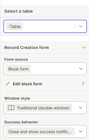 - When using Add a record: select the target table, configure the creation form, choose the window style, and set the success behavior