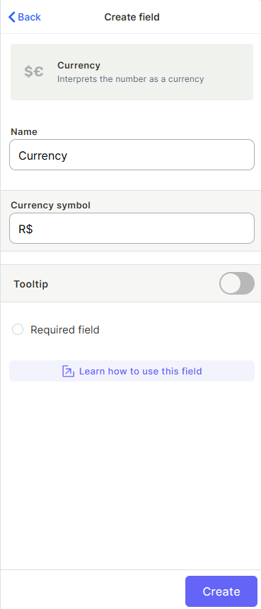 The Currency field stores a numeric value formatted as a monetary amount. You can define the currency symbol to display alongside the number, making it easy to represent prices, costs, revenues, and other financial values.