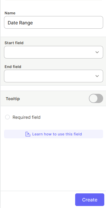 Note: You must create the two Date fields (start and end) before adding a Date Range field. The Date Range field does not create new date columns — it links to existing ones.