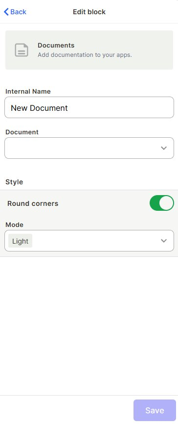 The Documents block embeds a document directly inside an app page, making it visible to users without requiring them to navigate elsewhere.