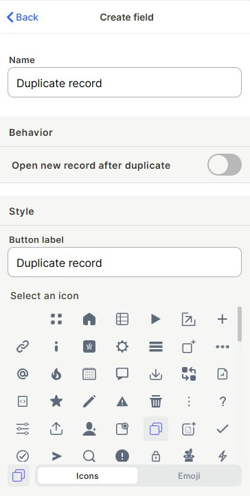 Step 2 — Set the Button label that will appear on the button in each row (e.g., "Duplicate record").