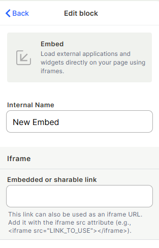 Add the link: In the Embedded or sharable link field, paste the URL of the page or widget you want to embed. This can be a standard shareable link or a direct iframe URL (the value you'd put in <iframe src="..."></iframe>).