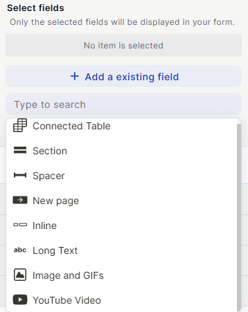 Under Select fields, click + Add an existing field to choose which fields from the connected table will appear in the form. Only the fields you add here will be shown to users. Fields can be reordered by dragging them after they are added.