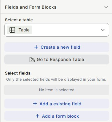 Fields and Form Blocks is the section inside Super Form where you define what appears in the form. You connect the form to a table, choose which fields from that table will be collected, and optionally add form blocks — content elements that help structure and guide the user experience without capturing data.