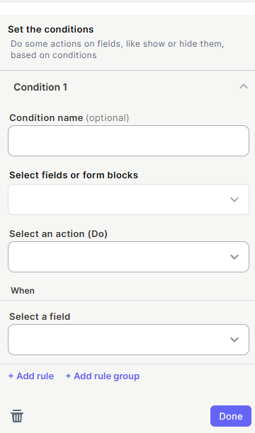 Define the rules (When): Under When, open the Select a field dropdown to choose which field triggers this condition. Then define the rule — such as the value it must have for the condition to activate. Click + Add rule to add more rules to the same condition, or + Add rule group to create a grouped set of rules with its own logic.