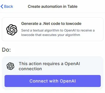 Connect your OpenAI account: This action requires an OpenAI connection. Click Connect with OpenAI and authorize access.