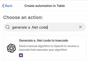 Choose the action: In the action search bar, type generate a .Net code and select Generate a .Net code to lowcode.