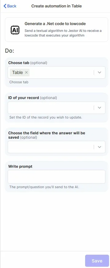 This action sends a text prompt describing an algorithm to Jestor AI, which returns a .Net code snippet ready to be used inside Jestor's lowcode editor. Instead of writing code manually, you describe what you want to happen and the AI generates the logic for you.