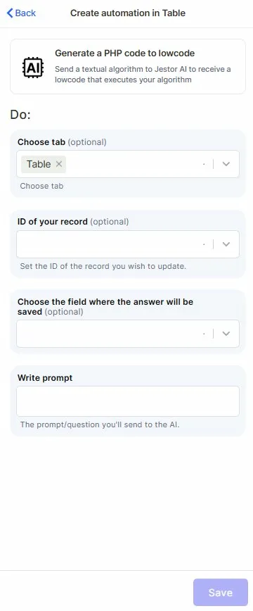 This action sends a text prompt describing an algorithm to Jestor AI, which returns a PHP code snippet ready to be used inside Jestor's lowcode editor. Instead of writing code manually, you describe what you want to happen and the AI generates the logic for you.