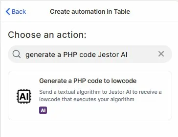 Choose the action: In the action search bar, type generate a PHP code Jestor AI and select Generate a PHP code to lowcode.