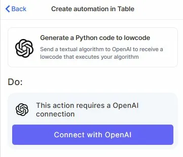 Connect your OpenAI account: This action requires an OpenAI connection. Click Connect with OpenAI and authorize access.