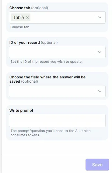 - This action does not have access to your table structure or field names unless you explicitly describe them in the prompt.