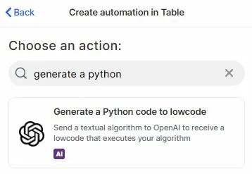 Choose the action: In the action search bar, type generate a python and select Generate a Python code to lowcode.