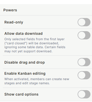 Powers is the section inside Smart Kanban that controls what users can do with the kanban block. Each power either restricts or unlocks a specific interaction, letting you tailor the kanban experience for different audiences and use cases.