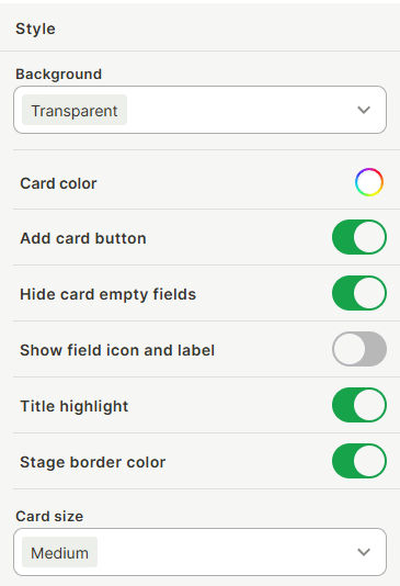 - Style settings apply to the entire kanban block — individual stages or cards cannot have different style settings outside of Conditional Cards Color.