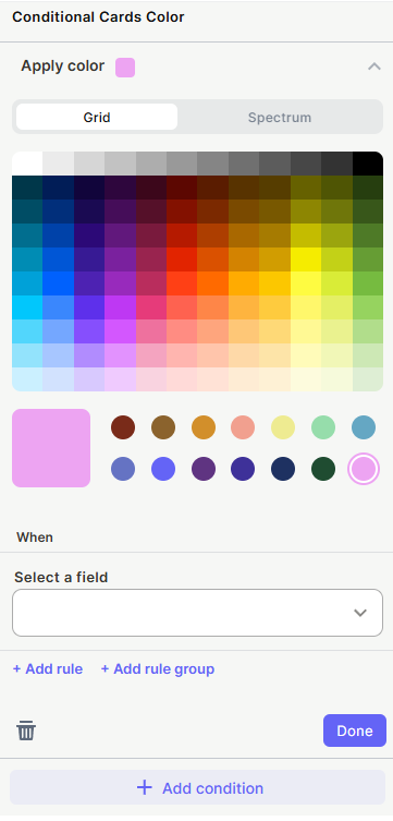 - Apply color — Select the color to apply to matching cards using the Grid (preset swatches) or Spectrum (full range) color picker.