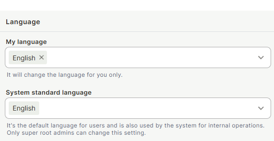 System standard language — The default language applied to all users who haven't set a personal language, and used by the system for internal operations. Only super root admins can change this setting.