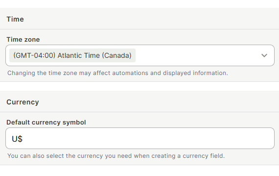 Default currency symbol — The currency symbol pre-filled when creating currency fields (e.g., R$, $, €). You can still choose a different currency on a per-field basis when creating a currency field.