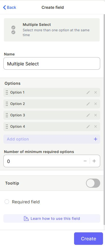 The Multiple Select field lets users pick one or more predefined options from a list. All options are created by you in advance, and users can select as many as needed at the same time.