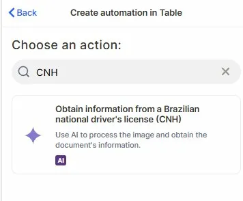 Choose the action: In the action search bar, type CNH and select Obtain information from a Brazilian national driver's license (CNH).