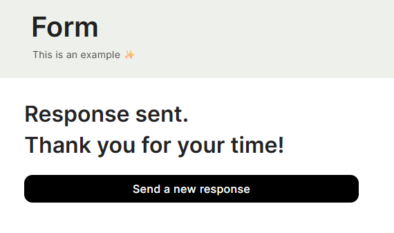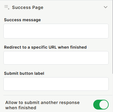 Allow to submit another response when finished — When enabled, a button appears on the success screen letting the user submit a new response without navigating away.