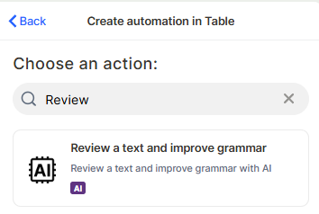 Choose the action: In the action search bar, type review a text and select Review a text and improve grammar.