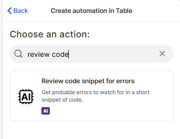 Choose the action: In the action search bar, type review code and select Review code snippet for errors.