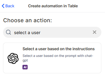 Choose the action: In the action search bar, type user chat-gpt and select Select a user based on the instructions.