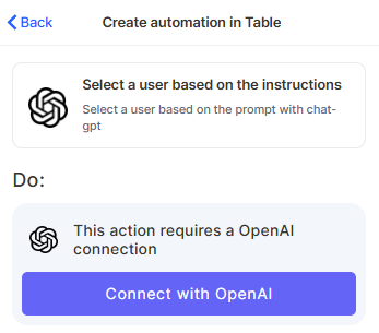 Connect your OpenAI account: This action requires an OpenAI connection. Click Connect with OpenAI and authorize access.