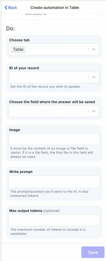 Select the field in your table where Jestor AI's response will be stored. This field must already exist in the table — the automation will not create it automatically. Use a Long Text field for most use cases.