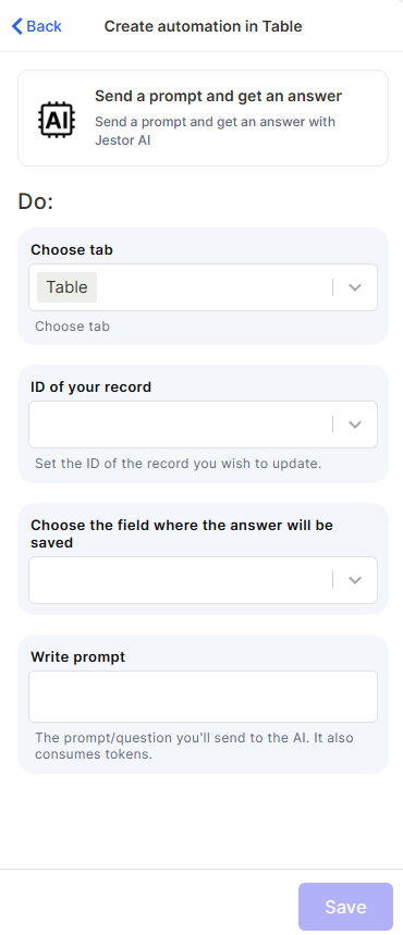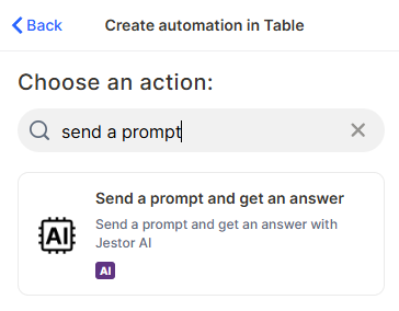 Send a Prompt and Get an Answer with Jestor AI is an automation action that sends a text prompt to Jestor's built-in AI and saves the response into a specified field of a chosen record. The prompt can include dynamic values from your table, making it possible to generate contextual, record-specific content automatically.