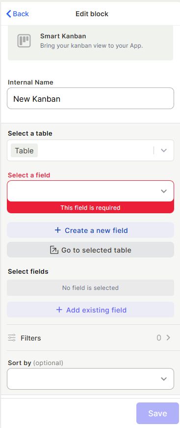 - The Select a field dropdown defines the stages — only fields with discrete values (like Select or Status) produce meaningful columns.
