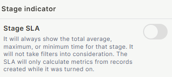 - Stage SLA only calculates metrics from records created after the toggle was turned on. Records that existed before enabling Stage SLA are not included in the calculation.