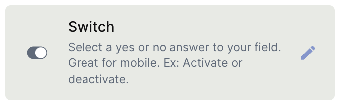 The Switch field stores a binary value — on or off — for each record, displayed as a toggle. It works the same way as a Checkbox but with a visual style better suited for mobile interfaces and touch interaction.