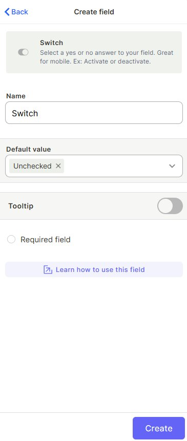 - The Switch field is functionally identical to the Checkbox field — the difference is purely visual. Both store a binary value.