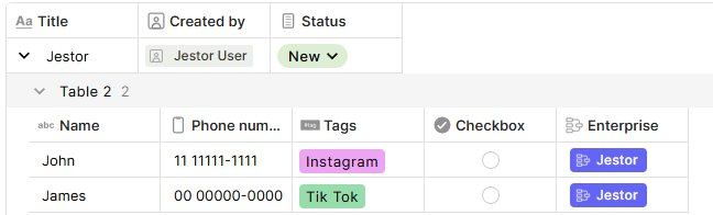 The Table block supports displaying connected records directly beneath each row, without opening the record. When enabled, each row expands to show a nested table of its related records from a connected table.