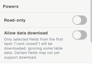 - Allow data download — when enabled, users can download the table data. Only fields visible in the closed card (first layer) are included. Some field types may not yet support download.