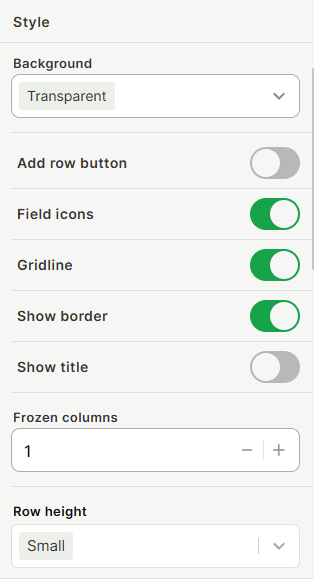 - Customize visual style: background, gridlines, borders, row height, and frozen columns