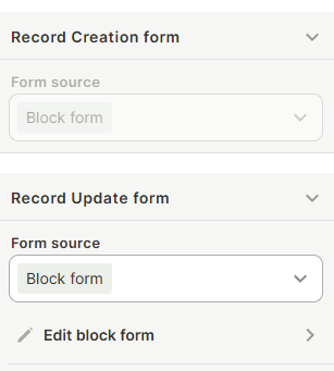 Configure how records are created and updated from this block. For detailed instructions on building and editing forms, see the Forms page.