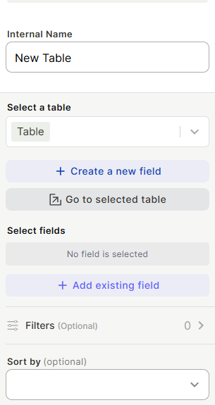 Select a table — choose which table this block displays. You can also use + Create a new field to add a field directly to the selected table, or Go to selected table to open the table without leaving the page.