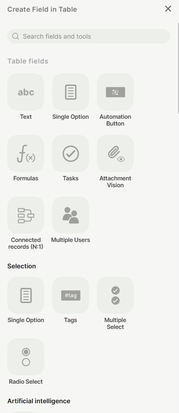 Jestor offers a wide variety of field types, from simple text and numbers to relationships between tables, formulas, and file attachments. Every field type has its own behavior, settings, and use cases.