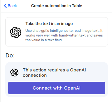 Connect with OpenAI: This action requires an OpenAI connection. Click Connect with OpenAI and follow the authentication steps to link your OpenAI account.