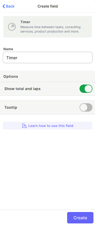 The Timer field tracks elapsed time directly inside a record. You can start, pause, and stop the timer, record multiple laps, and see the total accumulated time — all without leaving the record.