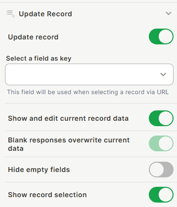 - Show record selection — When enabled, allows the user to select which record they want to update directly from the form, instead of relying on the URL to define it.